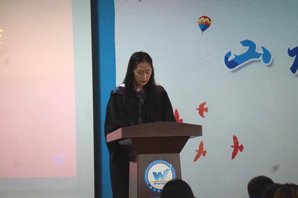 毕业学生代表孙洁致辞,她希望同学们在今后的人生道路上能够继续求索和笃行,充满斗志和热情、学会珍惜与感恩,同时为老师和同学送上祝福。