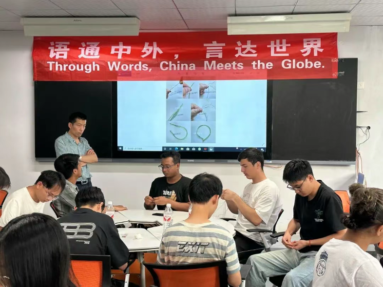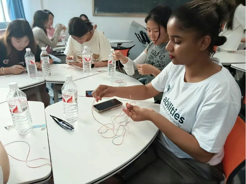 在五彩绳制作环节中,中外学生围坐在一起,在PPT教程的指引下,学生们动手编织五彩绳。中国学生热情地向国际学生传授编织技巧;国际学生凭借独特的创意与文化视角,为五彩绳融入了本国的文化元素,现场气氛热烈而融洽。