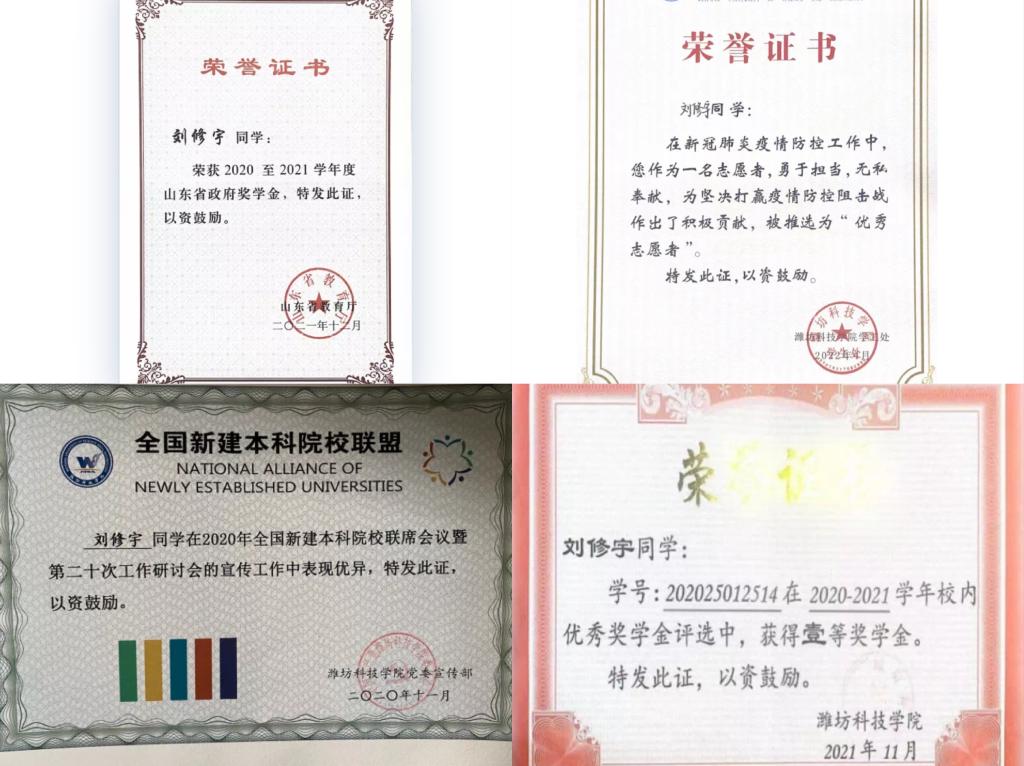 “书山有路勤为径,学海无涯苦作舟”,脚踏实地,认真钻研是刘修宇的学习态度。谈及学习方法,他说:“课前预习、课中听讲记笔记、课后复习和整理,一步都不能少。”他坚信学习没有捷径,唯有踏实努力才是成功的秘诀。作为一名语言专业的学生,他深知语言学习需要付出巨大的努力。他在课堂上始终保持端正、谦虚的学习态度,积极配合老师教学工作,努力提高专业知识水平,获得了任课老师和同学们的肯定。大一大二学年综合测评成绩都位居专业第一,专业成绩位居专业第二。在2021年-2022年先后获得“省政府奖学金”,“校一等奖学金”。