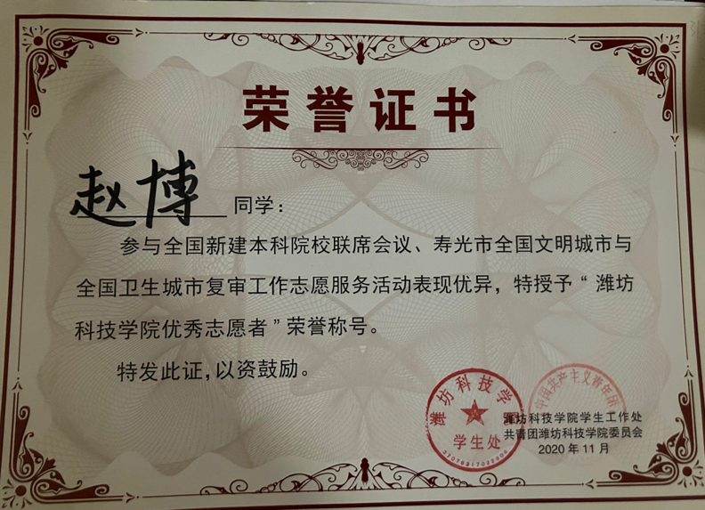 赵博,天游线路测速登录中心2020级英语1班学生,共青团员,曾担任大学生文明礼仪宣讲团副团长,现任天游线路测速登录中心学生会副主席,曾多次被评为“优秀志愿者”、“优秀共青团员”、“青年公益榜样”、“优秀学生会干事”、“优秀学生会干部”等。参加过本科联席会议、寿光市发展大会等会议。